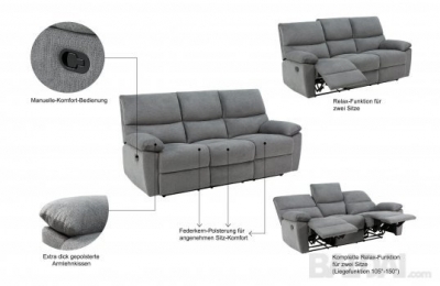 Aukštas geros kokybės, patogus sėdėti komplektas, spyruoklinis blokas,dengtas geros kokybės audiniu , trivietė ir dvivietė sofa turi po du mechaninius reglainerius.